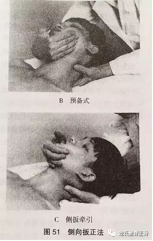 适用于颈椎 2-6 侧弯、侧摆式错位的钩突关节错位。患者仰卧,术者立于床 头,一手拿其后颈并以拇指按住患椎横突侧方并向隆起处按压(侧摆者只按一点,侧弯者由 下而上按压) 。另一手托住下颌并以前臂贴其面颊部,两手合作将患者头向上牵引并屈向健 侧再屈向患侧, (让错位关节先开后合) 当颈屈向患侧至最大角度时, “定点” , 拇指 不放松, , 并与“动点”手协同作扳、按、牵联合“闪动力”以使错位关节复位,有时病人可改用侧卧 位,去枕,用抬头作侧扳按动作,与侧头摇正法相同,抬头角度加大。C6-T2 侧摆、侧弯式 错位者,可将“动点”改为推肩拉肩法,此法必须使错位椎间侧屈活动度加大才能成功。