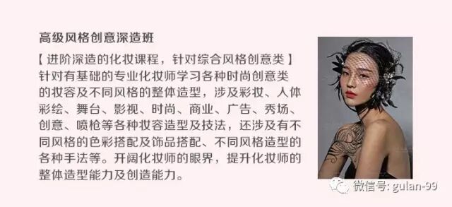 针对有一定化妆基础,以时尚创意类妆容造型为主;包括平面广告妆、舞台妆、影视妆;彩绘与整体妆容的结合;各种特效妆(骷髅妆、老年妆等)以及特色妆容等;高清喷枪化妆以及色彩的运用。以拓展思维,开拓视野为主。